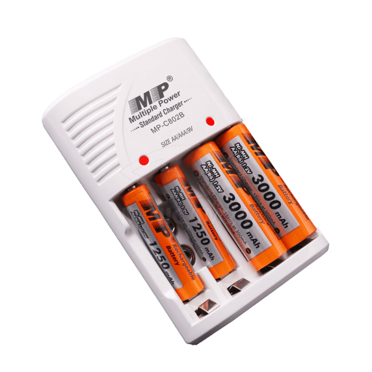 Зарядное устройство MP-C802B на 4 аккумулятора (NiMH) представляет собой адаптер, в котором можно размещать одновременно 2 или 4 никель-металлогибридных батареек. Устройство ПЗУ выполнено из белого пластика и оснащено индикаторными светодиодами, по которым можно отследить статус зарядки. В пуско-зарядное устройство можно устанавливать аккумуляторы типа АА/ААА. Зарядка аккумулятора автомобиля, цифровых камер, микрофонов и других электронных устройств защищена от перенапряжений и автоматически останавливается после полного восстановления энергии.
